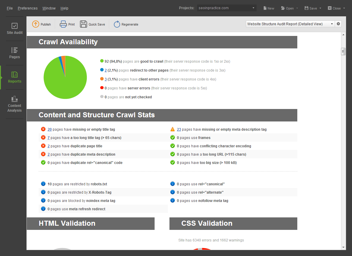 Explore your website structure, see issues that may potentially affect crawlability, PageRank distribution, trigger duplicate content alarm, or in any other way hamper your website promotion.