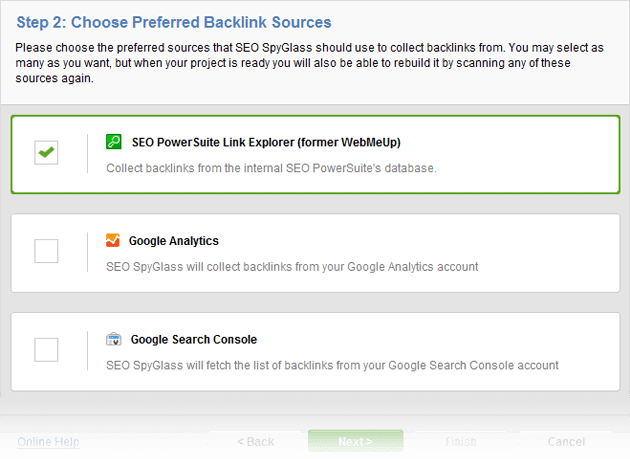 Tips: 1. Pull backlinks from Google Search Console and Google Analytics. For an even more comprehensive backlink picture, you may want to use all 3 backlink sources integrated into SEO SpyGlass. To do this, check the Show expert options box at Step 1 of creating a project, and you'll be able to pick backlink sources at Step 2. SEO PowerSuite Link Explorer is used by default — it's our in-house link index that's updated non-stop, in real time. You can also select Google Analytics and/or Google Search Console to complement the backlink search.