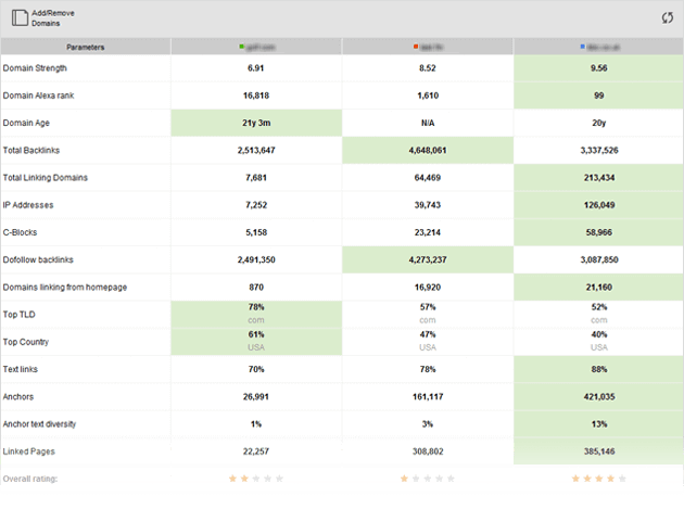 How-to: Add competitors' sites for comparison. In your SEO SpyGlass project, navigate to the Domain Comparison module and specify the URLs of your top SEO competitors. Voila! Your backlinks will be compared to those of your top ranking rivals against a bunch of crucial link factors, with a 1 to 5 overall rating assigned to each site.