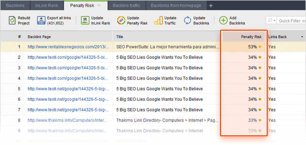 Calculate Penalty Risk. In SEO SpyGlass' Backlink Profile module, switch to Linking Domains — here, you'll be able to review & analyze the domains that link to your site. Go to the Link penalty risk tab. Select all domains and hit .