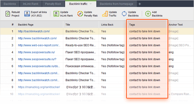 3. Use tags. You may want to tag some of your backlinks at this stage, so that you can quickly sort out all the links that require further action (e.g. if you plan to contact the webmaster to ask for link removal). To tag a backlink, right-click it and choose Add tags to selected record.