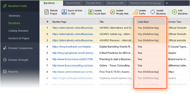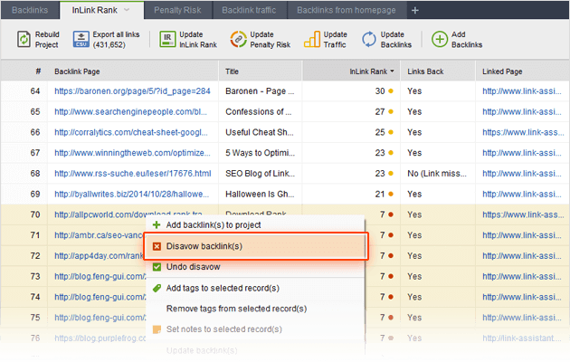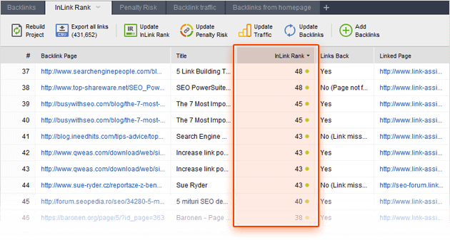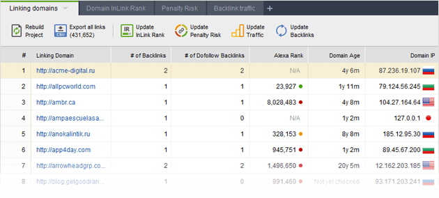 2. Check InLink Rank. This metric, being an alternative to Google’s PageRank, shows the value of your backlinks. The higher InLink Rank score means that these links (or domains if your check Domain InLink Rank) are the most valuable in your profile. And a low score helps you to identify low quality, spammy links. If you see that there are such links in your profile, you should consider to remove them to stay safe from search engine penalties.