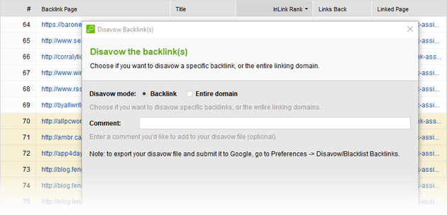 3. Export your disavow file. After you've added all links you're about to disavow to the list, go to Preferences -> Disavow/Blacklist Backlinks. At this stage, you can edit the comments by double-clicking any comment to make changes. Clicking Add lets you add links to your disavow links, and clicking Remove deletes selected records from the list. In the Choose the action menu, you can select whether you'd like to simply disavow the backlinks, disavow and exclude them from all future updates you make in the project, or disavow and blacklist the links (have them removed from the project completely).
