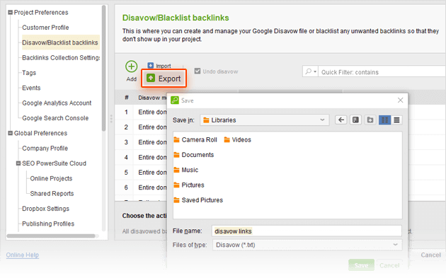Once you're happy with you disavow list, hit the Export button and select the folder to save the file in so that you can upload it to Google Webmaster Tools.