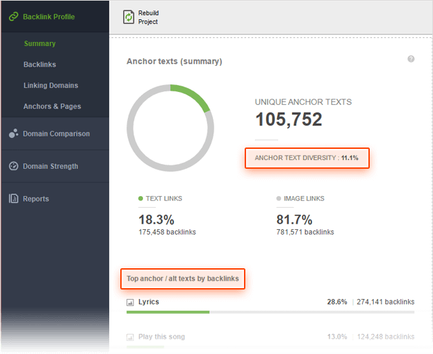 2. Explore competitors' links in-depth. When you were adding competitors to the comparison, SEO SpyGlass created a project for each of them in the background. In the Projects drop-down menu, select a competitor you'd like to look at in detail, and hang on a moment while SEO SpyGlass loads all the data. Switch to the Summary module for an overview of the competitor's link profile. The anchor-related part can be especially useful for ideas on new anchors for your links. Anchor diversity (unique anchors divided by backlink count) is also an important metric to consider — it'll give you a solid idea on how many of your anchors you need to optimize for your target keywords.