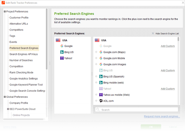 How-to: Set up your target SEs. Run Rank Tracker and open your project. Go to Preferences -> Preferred Search Engines and select your target search engines from the list of over 570 supported ones.