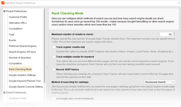Do you need to check search engines' top 100 results for your ranks — or maybe top 50 or just the top 10? If your site is found in SERPs for a given term more than once, would you want to see all of the site's rankings for each keyword, or are you only interested in the highest rank? In Rank Tracker, you can set these options up — along with other useful prefs.