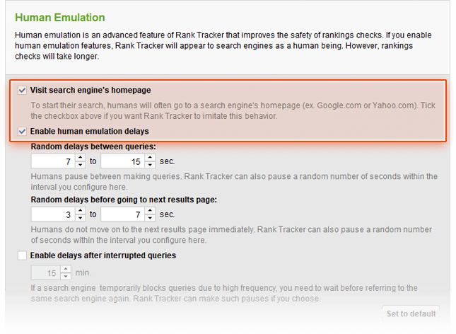 Tips: Adjust the search safety settings. As you probably know, search engines can be sensitive to automated requests, throwing in CAPTCHAs and occasionally even blocking IPs to prevent their servers from overload with queries sent by robots. In Preferences > Search Safety Settings in Rank Tracker, you'll find a number of prefs that will help you stay search engine-friendly and keep your IP undetected as you check your ranks. If you check rankings regularly for a project with up to 100 keywords, we recommend using the following combo of settings.