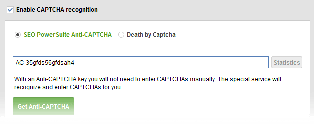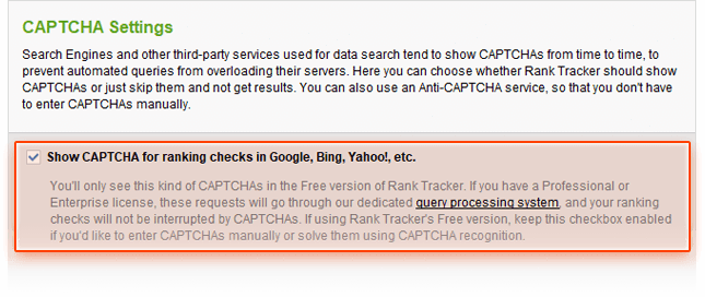 - In Preferences > Search Safety Settings > CAPTCHA Settings, check the Show CAPTCHA for ranking checks in Google, Bing, Yahoo!, etc. box.