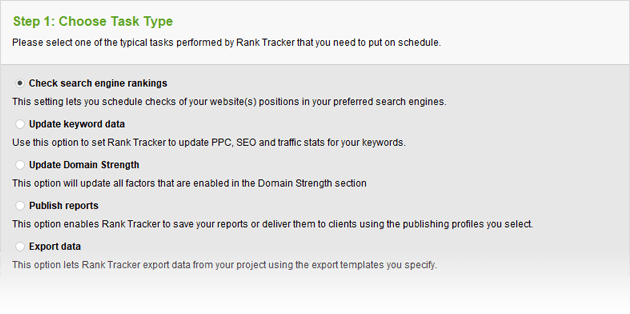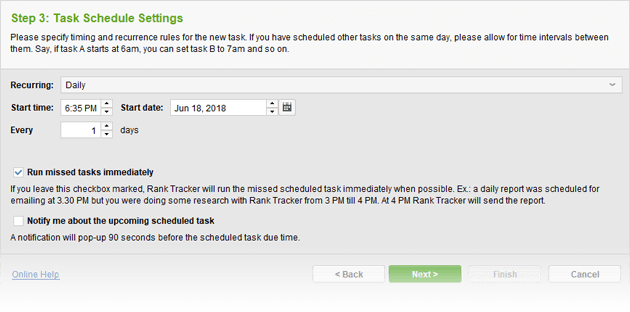 2. Schedule your ranking checks. Rank Tracker gives you an option of automating your ranking checks so that you don't have to run them manually each time. To set scheduled check-ups, go to Preferences > Scheduler, and click to create a new scheduled task.