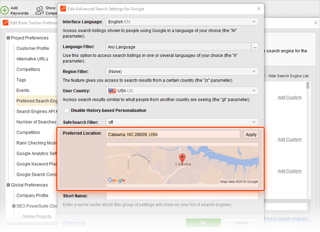 If your target location is different from where you actually are, or if you need to track rankings for several specific locations, you can set that up quickly in Rank Tracker's Advanced Search Settings.
