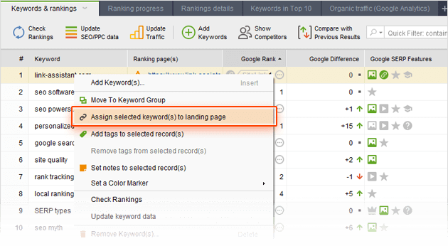 How-to: Assign your keywords to landing pages. In Rank Tracker, select the keyword(s) you're optimizing a certain page for, right-click the selection, and hit Assign selected keyword(s) to landing page.