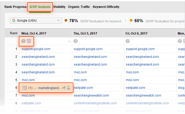Whenever your site is found within any of SERP features as you check your rankings, you will see an icon of the SERP feature your site was found in (if any). The three dots you can see in the same column mean that your site was found in the SERP more than once. You can click them to see all the results.